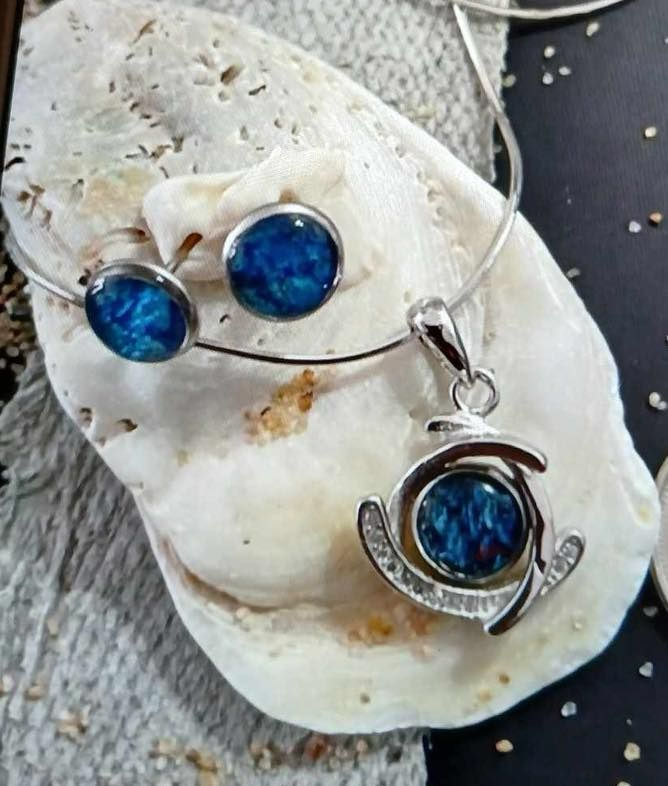 Après de nombreux essais, erreurs et prototypes, une sélection s’est naturellement imposée : ce sont les petites pastilles de cuir de poisson qui ont été retenues. Pour mettre en valeur cette matière originale, la peau de poisson est tannée, colorée, puis recouverte de résine, lui donnant l’apparence d’une pierre précieuse tout en laissant entrevoir les reliefs naturels des écailles.